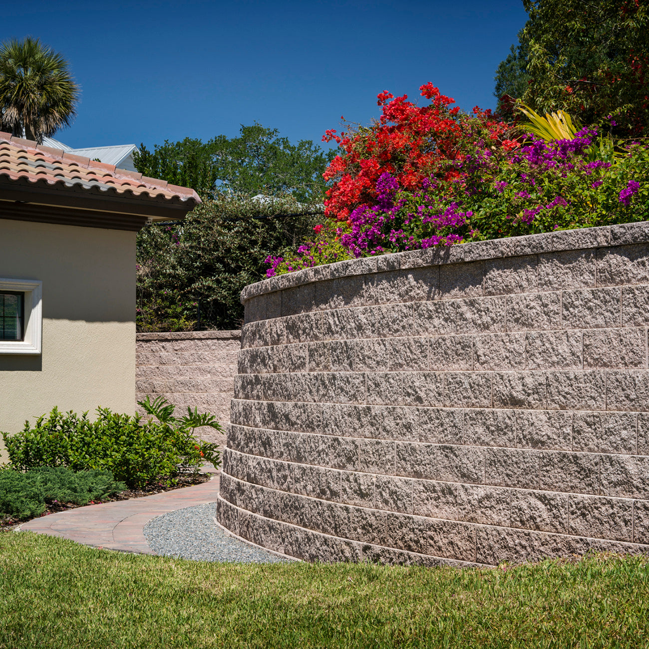 The Diamond Pro® retaining wall system is an ideal choice for large-scale projects. With a rough-hewn face style, it gives landscapes substance and stability.